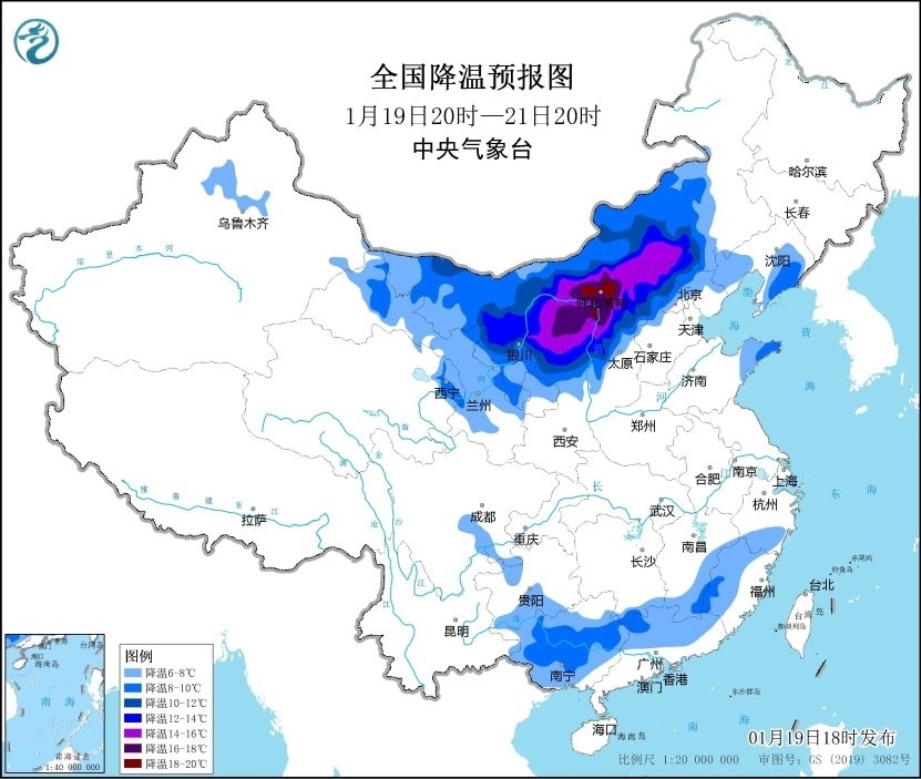 預計,1月19日20時至1月21日20時,西北地區(qū)東部、內(nèi)蒙古中西部、華北北部、華南等地的部分地區(qū)將降溫8~12℃,其中,內(nèi)蒙古河套地區(qū)和中部、陜西北部、山西北部、河北西北部等地部分地區(qū)降溫可達14~16℃,局地可超過18℃。