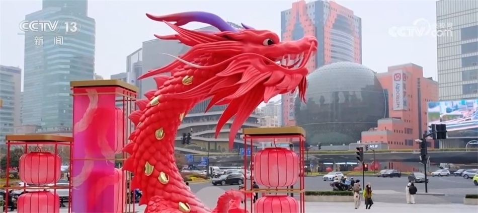 這幾天,南京路上各種龍元素裝置和商品將步行街裝飾一新;在南京西路商圈,這個造型裝置宛若一只巨龍騰空而起,頗有氣勢;在上海徐家匯、中山公園、前灘等商圈,各色龍元素燈組亮相;在龍華商圈,戲臺也演繹出龍的造型,大街小巷春節(jié)氛圍滿滿。