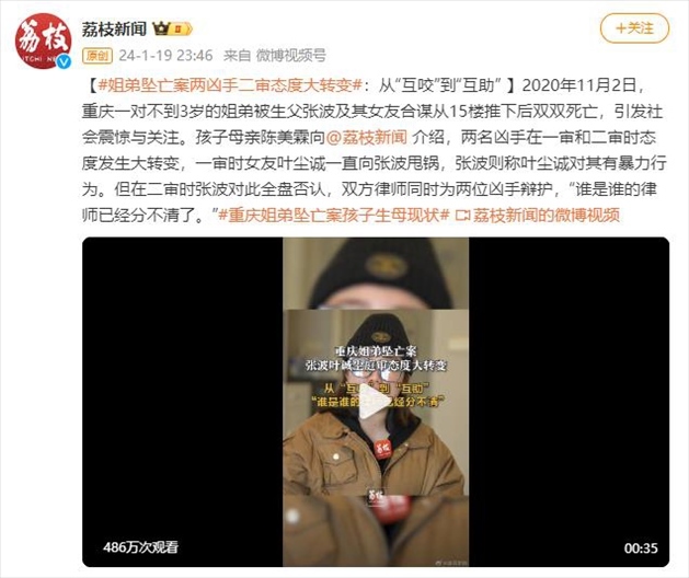 ·重慶姐弟墜亡案孩子母親陳美霖近日向媒體介紹,兩名兇手在一審和二審時(shí)態(tài)度發(fā)生大轉(zhuǎn)變,一審時(shí)女友葉塵誠一直向張波甩鍋,張波則稱葉塵誠對其有暴力行為。但在二審時(shí)張波對此全盤否認(rèn),雙方律師同時(shí)為兩位兇手辯護(hù),“誰是誰的律師已經(jīng)分不清了。”