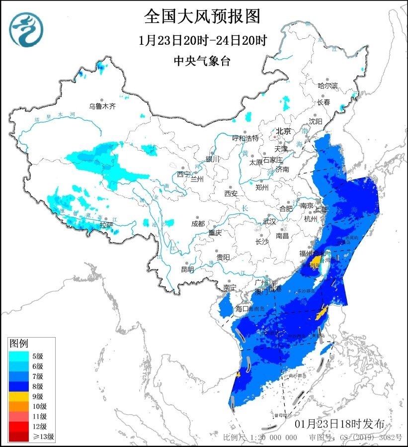 1月24日20時(shí)至25日20時(shí),青海北部和西部、福建沿海等地部分地區(qū)有5~6級(jí)、陣風(fēng)7級(jí)的大風(fēng);臺(tái)灣海峽、巴士海峽、南海大部海域?qū)⒂?~8級(jí)、陣風(fēng)9~10級(jí)的大風(fēng),其中南海西南部的部分海域風(fēng)力可達(dá)9級(jí)、陣風(fēng)10級(jí)。