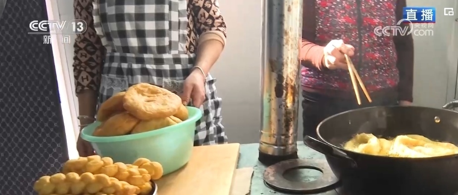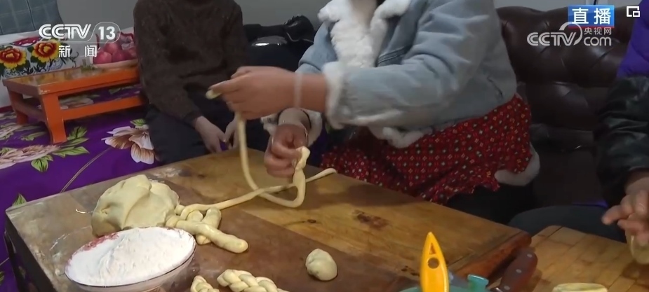 炸年饃是當(dāng)?shù)赝磷迦罕娪哟汗?jié)的傳統(tǒng)習(xí)俗。一家人齊上陣,這邊兩位大姐正在將發(fā)好的面揉好、揪出面劑子、搟成圓形、表面抹上清油,放進油鍋里炸熟。對于土族群眾來說,進入臘月之后就開始做年饃、宰年豬、置辦年貨,年味兒就濃了。炸年饃是當(dāng)?shù)厝罕娖碓感碌囊荒觑L(fēng)調(diào)雨順、五谷豐登、平安順遂的美好寓意。制作年饃的面粉、菜籽油等材料都是政府給受災(zāi)群眾提供的物資。