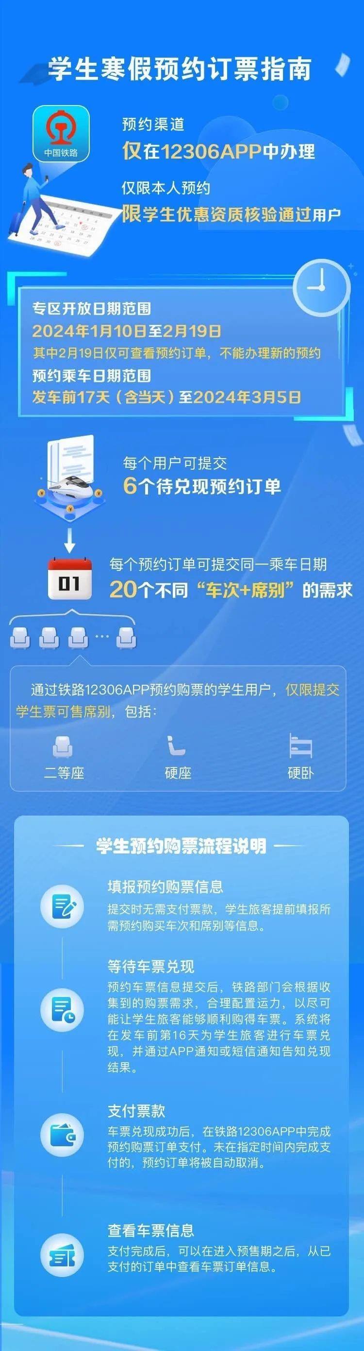 為保障學(xué)生、務(wù)工人員等重點(diǎn)群體春運(yùn)出行,自1月10日零時(shí)起,鐵路12306手機(jī)客戶端推出春運(yùn)期間學(xué)生、務(wù)工人員專區(qū)預(yù)約購票功能,符合條件的旅客朋友可通過12306手機(jī)客戶端專區(qū)預(yù)約購買春運(yùn)期間往返火車票。