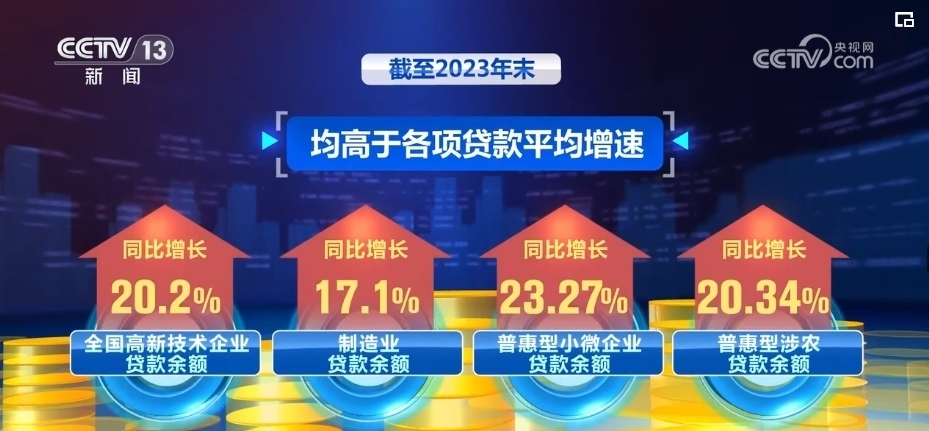 截至2023年末,全國高新技術企業(yè)貸款余額同比增長20.2%,制造業(yè)貸款余額同比增長17.1%,普惠型小微企業(yè)貸款余額同比增長23.27%,普惠型涉農(nóng)貸款余額同比增長20.34%,均高于各項貸款平均增速。