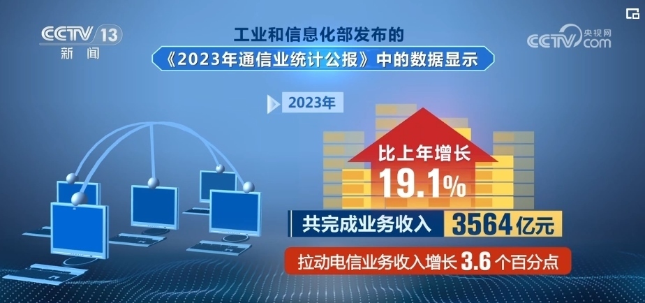 2023年,數(shù)據(jù)中心、云計算、大數(shù)據(jù)、物聯(lián)網(wǎng)等新興業(yè)務快速發(fā)展,共完成業(yè)務收入3564億元,比上年增長19.1%,拉動電信業(yè)務收入增長3.6個百分點。