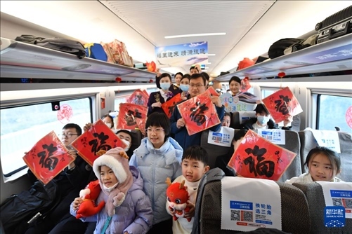 1月26日,在由南京南站發(fā)往太倉的G8981次列車上,南京客運(yùn)段的工作人員與收到“?!弊值穆每秃嫌?。新華社記者 柳文惠 攝