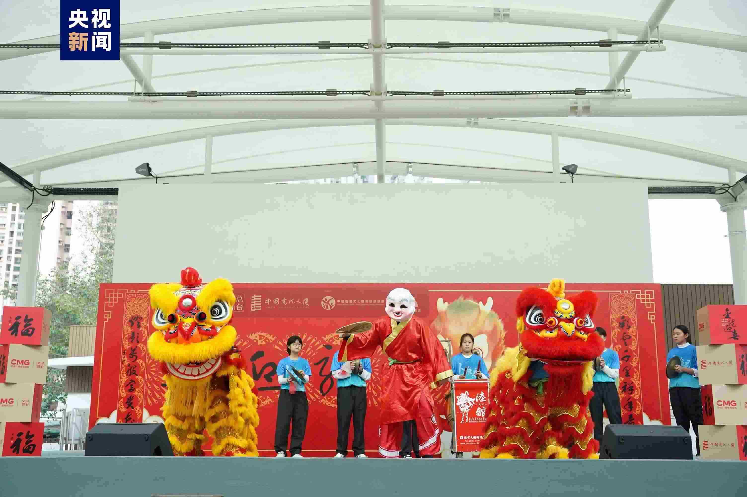精神振奮的醒獅表演、耳熟能詳?shù)某绷鹘鹎⑾矐c熱鬧的氣氛吸引了眾多香港市民駐足觀看。