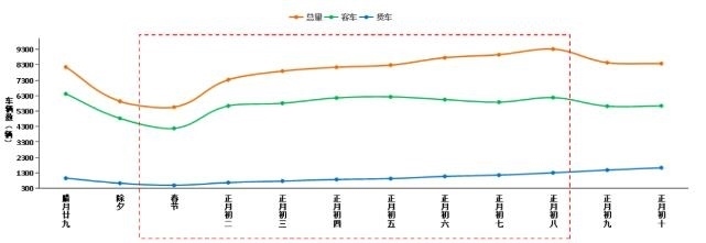預(yù)計(jì)春節(jié)期間(含除夕),普通公路日均斷面交通量約7800輛,同比2023年增長約8.2%,如圖4所示。相較于高速公路,普通公路在春節(jié)期間流量較為平穩(wěn),沒有顯著高峰,在節(jié)前明顯下降,除夕達(dá)到最低值,初三以后交通量有所回升。