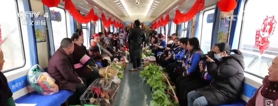 在貴州,有一趟往返于貴陽與玉屏之間的“慢火車”5640次列車,里面專設(shè)了一個(gè)農(nóng)特產(chǎn)品車廂。新春臨近,村民們將自家養(yǎng)殖的土雞、雞蛋,熏制的香腸、臘肉,以及水果、蔬菜帶上列車,向旅客現(xiàn)場售賣。