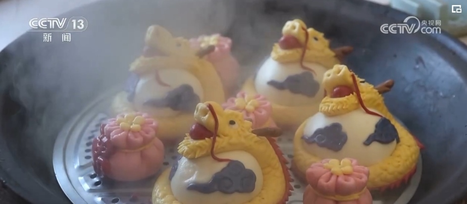 在黑龍江樺南縣,為了圖個(gè)熱鬧、沾個(gè)喜氣,誰家蒸花饃,鄉(xiāng)里鄉(xiāng)親都會(huì)前來幫忙。在村民張瑞雪家里,大家圍坐在桌前,小小面團(tuán)通過“一印、二捏、三鑲”等技法,再起鍋開蒸,就變成了精美的龍年花饃。這些花饃形態(tài)各異,有的威武雄壯、有的憨態(tài)可掬,不僅外觀吸引人,更承載著美好的新年祝福。