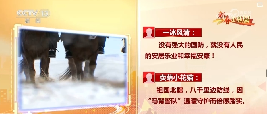 《新春走基層·馬背警隊(duì):風(fēng)雪中的溫暖守護(hù)》播出后,有網(wǎng)友說:“沒有強(qiáng)大的國(guó)防,就沒有人民的安居樂業(yè)和幸福安康!”。也有網(wǎng)友說:“祖國(guó)北疆,八千里邊防線,因“馬背警隊(duì)”溫暖守護(hù)而倍感踏實(shí)?!?br>
