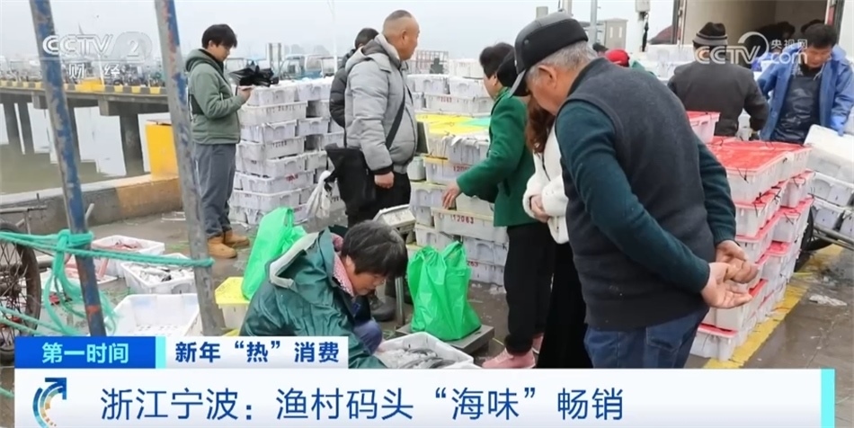 浙江寧波奉化區(qū)莼湖街道的漁村碼頭也進(jìn)入了年前最后的繁忙時(shí)刻。上午八點(diǎn),5艘運(yùn)輸船停靠在內(nèi)外碼頭上,據(jù)了解,一艘運(yùn)輸船有七八千箱漁獲物,近八成是帶魚(yú)。最近每天有百萬(wàn)斤東海魚(yú)貨就地銷售或運(yùn)往全國(guó)各地,預(yù)計(jì)將持續(xù)至臘月二十七。在碼頭邊桐照魚(yú)市場(chǎng)的攤位上,色澤鮮亮的帶魚(yú)、鯧魚(yú)、大黃魚(yú)等海產(chǎn)品琳瑯滿目,市民們忙著挑選,漁商們則賣力吆喝著。