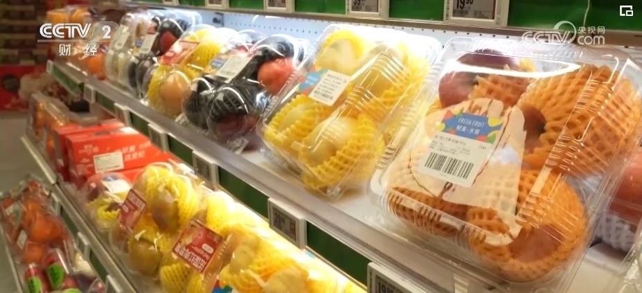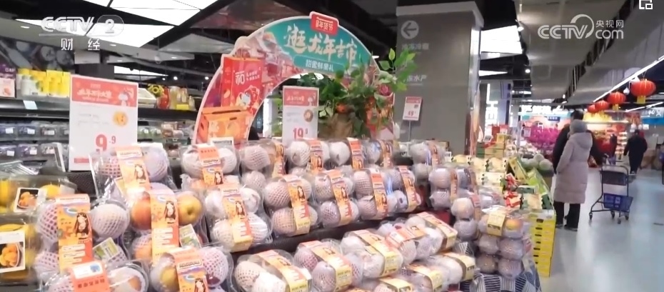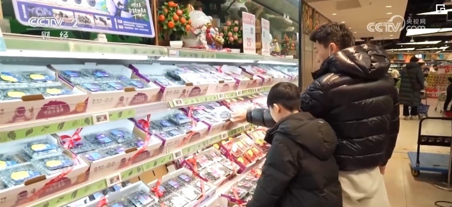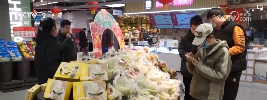 除了蘋果,各類葡萄、柑橘、車?yán)遄?、草莓、藍莓、菠蘿、榴蓮等水果也大量上市。僅記者采訪的這家生鮮超市,新奇特品種相比2023年,就有5%—10%的增長,春節(jié)前更是有100多款水果在店內(nèi)銷售,豐富了百姓的“果盤子”。