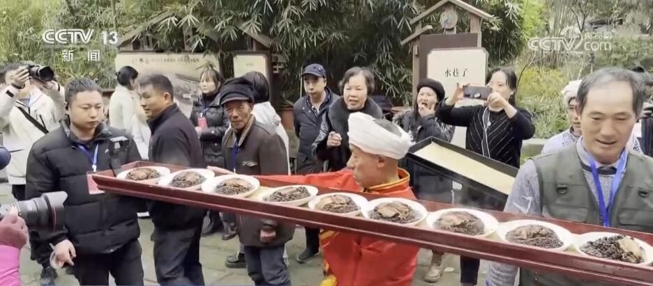在熱鬧的現(xiàn)場,最引人注目的就是“打盆”絕技,這也是川渝地區(qū)獨(dú)有的民俗上菜表演。四層高的蒸籠冒著熱氣,民間藝人將蒸籠里的菜肴放在一個(gè)長2米、寬20厘米的木托盤里,將其頂在頭上,不用手扶,傳送到長桌宴上。