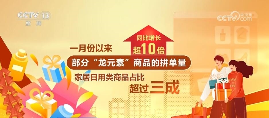“龍?jiān)亍碑?dāng)仁不讓地成為今年春節(jié)的新“頂流”,不光有龍年的福字對(duì)聯(lián),還有龍年臺(tái)歷、龍寶寶毛絨玩具、龍年紅色內(nèi)衣、龍年中國(guó)結(jié)掛飾成為最熱銷的春節(jié)周邊商品前五名。1月份以來(lái),部分“龍?jiān)亍鄙唐返钠磫瘟客仍鲩L(zhǎng)超10倍,其中,家居日用類商品占比超過(guò)三成。