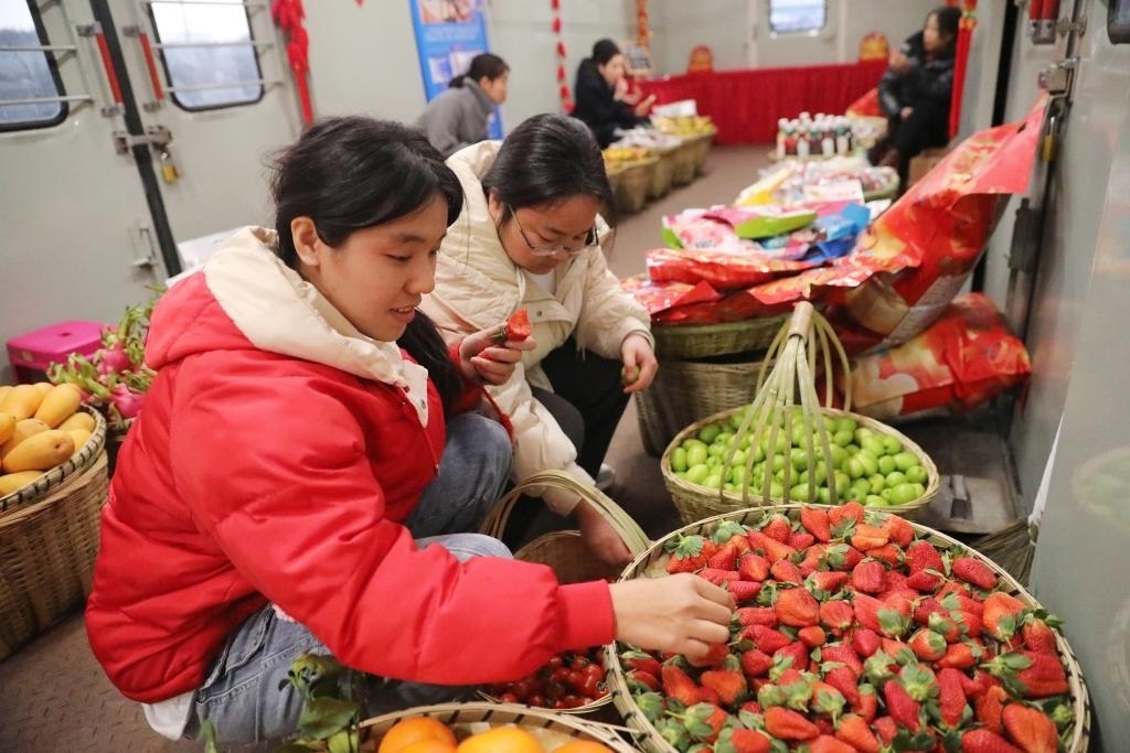 乘坐7466次列車的旅客在“慢火車”上的年貨街挑選草莓。(中國鐵路昆明局集團有限公司供圖)