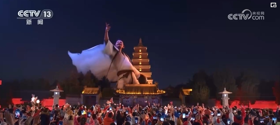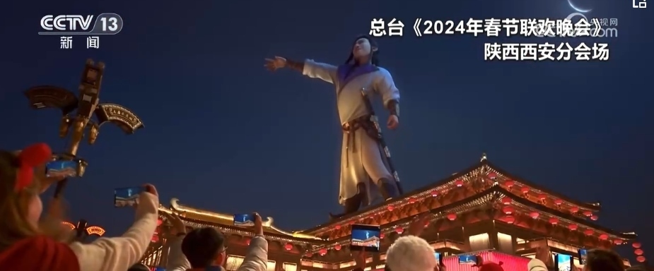 除夕當(dāng)晚9時(shí),西安分會(huì)場《山河詩長安》篇章的“打開方式”讓人眼前一亮。在科技助力下,“詩仙”李白跨越歲月長河“穿越”而來,在煙火璀璨中,隨著熙熙攘攘的人群一起走進(jìn)西安城墻永寧門,走入千年后的耀眼長安。