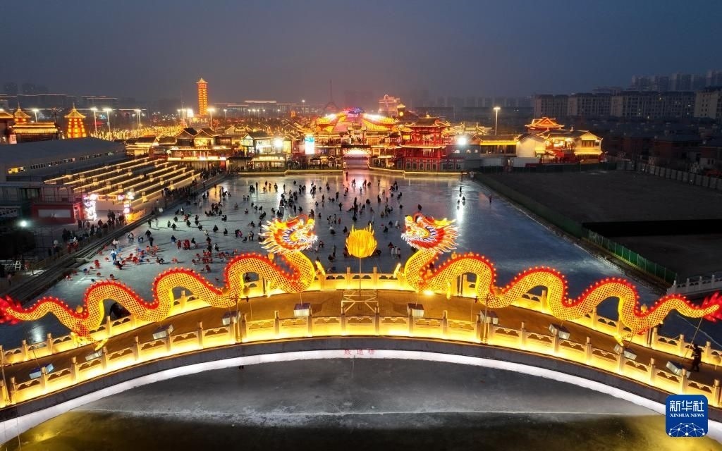 游客在河北省唐山市豐南區(qū)河頭老街滑冰場滑冰(無人機照片)。