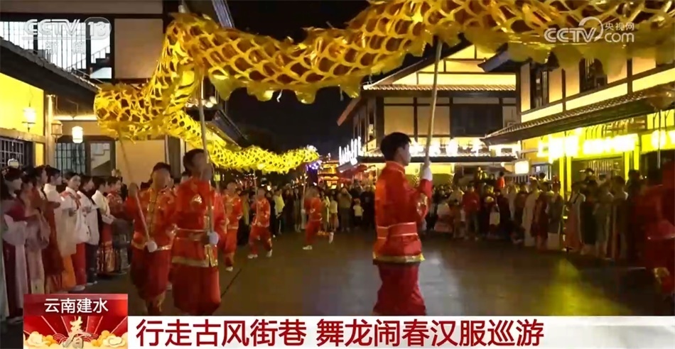 在云南紅河州建水縣紫陶里漢唐街區(qū),一場舞龍鬧春漢服巡游活動拉開了序幕。舞龍隊伍一路閃轉(zhuǎn)騰挪,一條黃色長龍奮力舞動,忽高忽低,飄忽飛逸。身著華美漢服的姑娘行走在古風(fēng)街巷間,一種古樸幽遠的韻味撲面而來。市民與游客在感受建水年味的同時,也體驗到中華傳統(tǒng)文化之美。