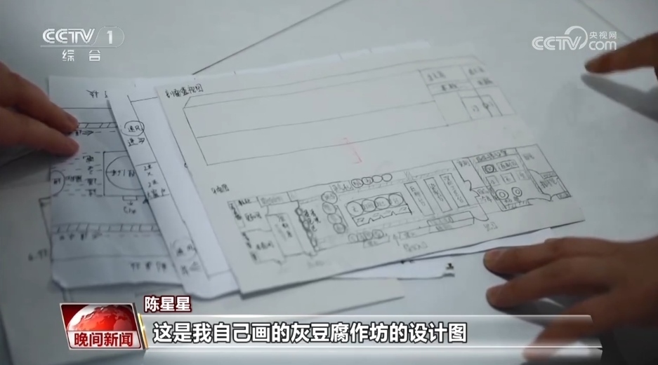 陳星星:這是我自己畫的灰豆腐作坊的設(shè)計(jì)圖。我們之前用傳統(tǒng)的在家里做的這種方式做出來(lái)的豆腐的話,一天最多可能就是一兩百斤的樣子,那么經(jīng)過(guò)我們這樣的一個(gè)改進(jìn)的話,一天可能能達(dá)到一兩千斤的產(chǎn)量。