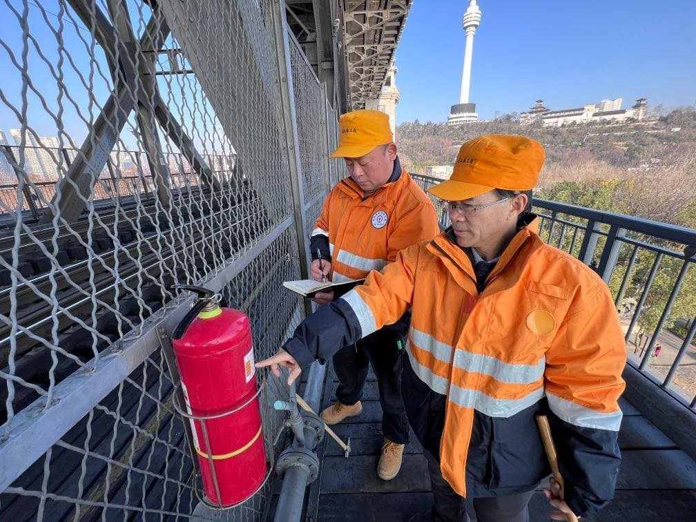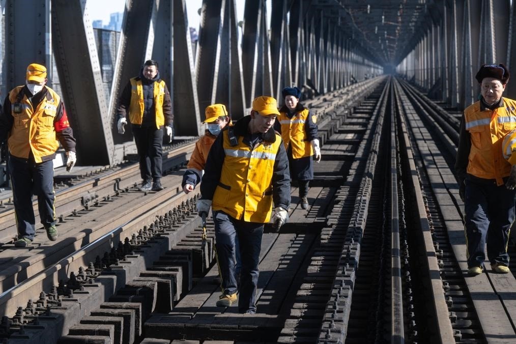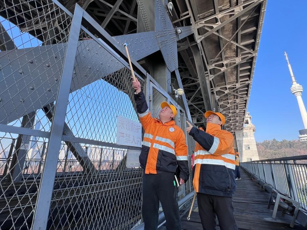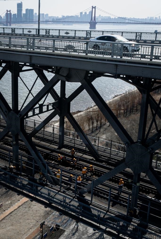 農(nóng)歷大年初三,湖北武漢陽光明媚。“萬里長江第一橋”——武漢長江大橋宛若一條巨龍飛架于江水之上,氣勢恢宏。身穿工作服的陳卿明和同事,低頭、彎腰,循著大橋鐵道仔細(xì)地檢視鋼梁、枕木。