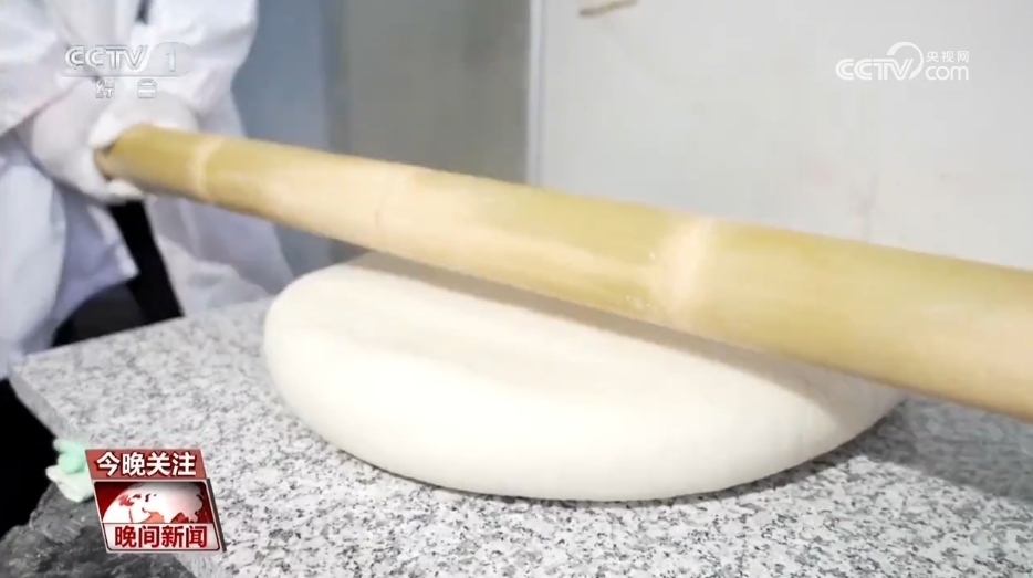 浙江省新昌縣日進(jìn)年糕加工廠負(fù)責(zé)人 王攀:我們用到的是定制的石頭和石臼,比如說石錘的大小、粗細(xì)、重量各方面都是精確計(jì)算。搗制工藝又是傳統(tǒng)的,所以這是保持它原風(fēng)味最重要的東西。