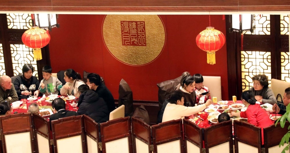 2024年2月9日,人們在江蘇省蘇州市一家餐館內(nèi)享用團(tuán)圓飯。新華社發(fā)(杭興微 攝)