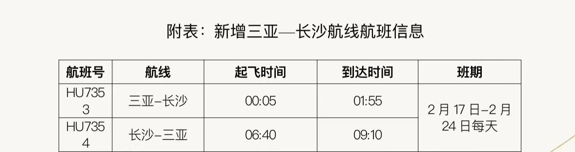 據(jù)悉,在民航局、海南省交通廳的支持下,海南航空積極協(xié)調(diào)申請(qǐng)加班計(jì)劃。2月17日至24日期間,海南航空每日新增三亞—長(zhǎng)沙往返航班。去程航班HU7353,從三亞起飛時(shí)間為凌晨 00:05,到達(dá)長(zhǎng)沙黃花國(guó)際機(jī)場(chǎng)時(shí)間為01:55;返程航班HU7354,從長(zhǎng)沙起飛時(shí)間為06:40,到達(dá)三亞鳳凰國(guó)際機(jī)場(chǎng)時(shí)間為09:10,以上航班信息以實(shí)際查詢?yōu)闇?zhǔn)。旅客可通過(guò)海南航空官網(wǎng)及APP、微信公眾號(hào)及小程序、服務(wù)熱線95339、各直屬售票處及授權(quán)代理購(gòu)買(mǎi)機(jī)票。