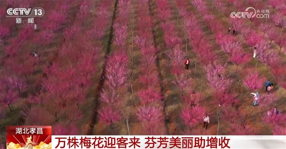 在湖北孝感孝昌縣鄒崗鎮(zhèn),萬株梅花也競相綻放,吸引了眾多市民游客來此“尋梅”。走進梅園,一簇簇梅花綴滿枝頭,蜜蜂飛舞其間,市民游客漫步在花海中,拍照記錄美好風(fēng)景。