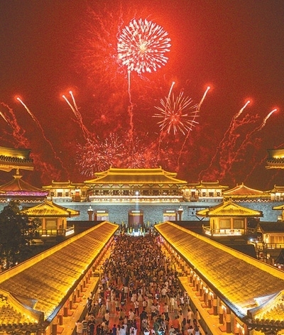 游客們在湖北省襄陽市唐城景區(qū)看煙花秀。當?shù)嘏e辦的戲曲文化藝術節(jié)吸引了眾多省內外游客前來,拉動當?shù)芈糜谓洕y(tǒng)計,2023年國內出游人次達48.91億,國內游客出游總花費4.91萬億元。楊 東攝(影像中國)