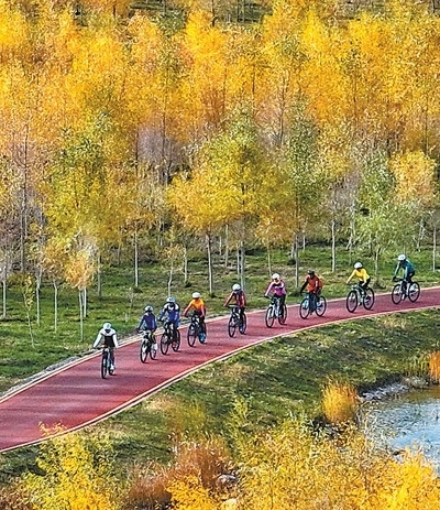 甘肅省張掖市奧林匹克森林公園,騎行愛好者們騎行穿過胡楊林。張掖市推進綠化工程,亂石灘“變身”森林公園,成了市民健身休閑的理想之所。王 將攝(影像中國)