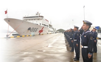 執(zhí)行“和諧使命—2022”任務的中國海軍“和平方舟”號醫(yī)院船返回浙江舟山某軍港,任務部隊官兵代表在碼頭迎接?!昂推椒街邸碧栣t(yī)院船是我國自主設計建造的首艘制式遠洋醫(yī)院船。自2008年入列以來,該船以“和諧使命”任務為主要載體,多次遠赴海外開展人道主義醫(yī)療服務。孫 飛攝(新華社發(fā))