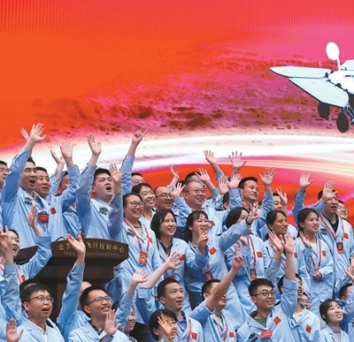 北京航天飛行控制中心青年科技人才群體慶祝我國首次火星探測任務著陸火星取得成功。目前,我國研發(fā)人才數(shù)量全球第一。新華社記者 金立旺攝