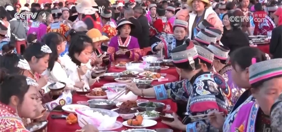 隨后,三合苗寨圍繞著“花樹(shù)”擺起長(zhǎng)桌宴,苗族同胞和游客們一起喝起水花酒、跳起蘆笙舞,一起歡慶新春到來(lái)。今年春節(jié)期間,安順各地將舉行上百場(chǎng)苗族跳花活動(dòng)。