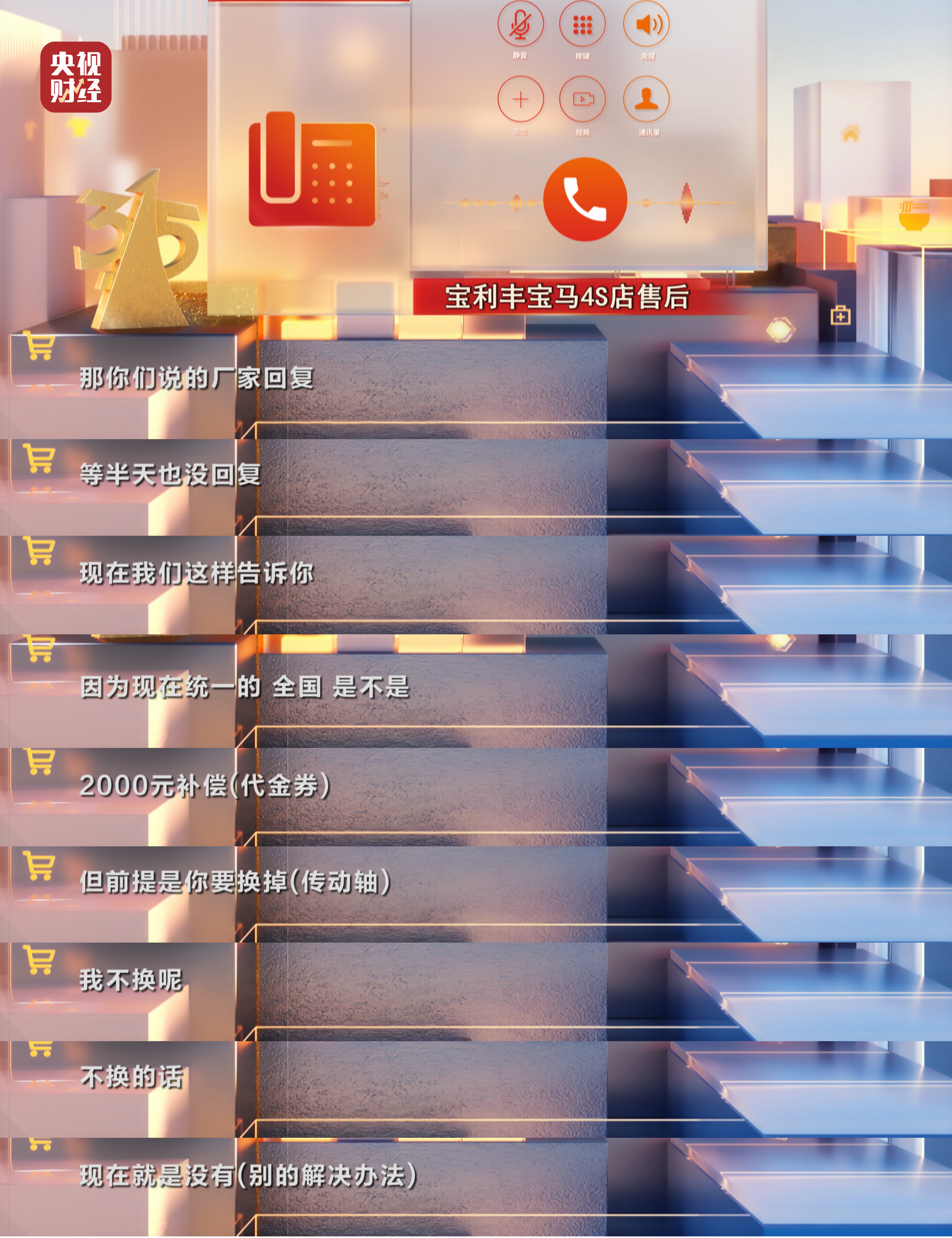傳動軸,是汽車動力總成中重要部件,剛買的新車就要更換傳動軸,等同于新車要動個“特大手術(shù)”,李先生堅決不同意。在與4S店多次交涉無果后,無奈之下,李先生撥通了寶馬廠家的客服電話??头藛T的回答讓李先生的心涼了半截。