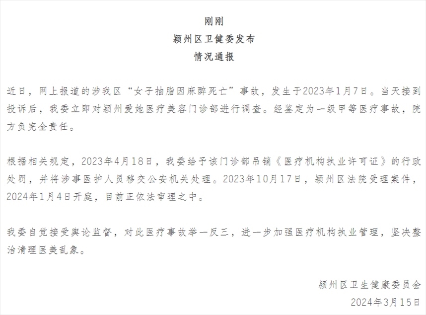 ·安徽阜陽一女子抽脂因麻醉死亡,官方通報。
