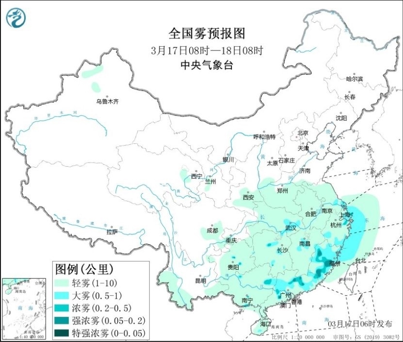 今晨,江蘇、上海、浙江南部、江西中部、福建、廣東、廣西北部、貴州中部等地部分地區(qū)出現(xiàn)大霧天氣,局地能見度不足200米。預(yù)計(jì)今天上午,上述地區(qū)的大霧天氣還將持續(xù),局地有能見度不足200米的強(qiáng)濃霧。此外,黃海南部海域、東海偏西海域、臺(tái)灣海峽將有能見度不足10公里的霧,其中東海西部海域、長(zhǎng)江口附近海域、杭州灣附近海域、浙江沿岸海域、福建北部沿岸海域?qū)⒂心芤姸炔蛔?公里的大霧。中央氣象臺(tái)今晨繼續(xù)發(fā)布大霧黃色預(yù)警。