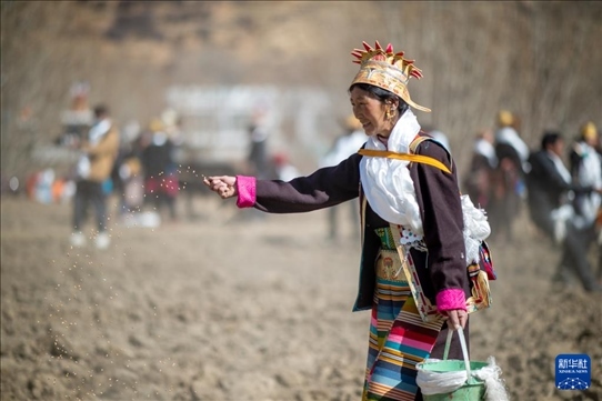 3月16日,在西藏山南市瓊結縣加麻鄉(xiāng)加麻村的春耕儀式現(xiàn)場,農民播撒種子。新華社記者 旦增尼瑪曲珠 攝
