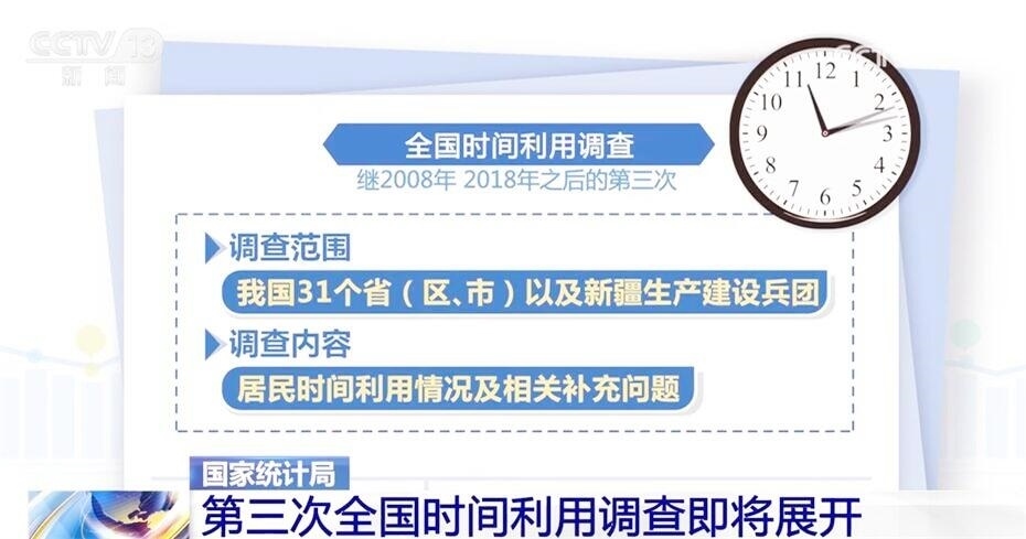 此次全國時間利用調查是繼2008年、2018年之后的第三次,調查范圍包括我國31個?。▍^(qū)、市)以及新疆生產(chǎn)建設兵團,調查的內(nèi)容為居民時間利用情況及相關補充問題。