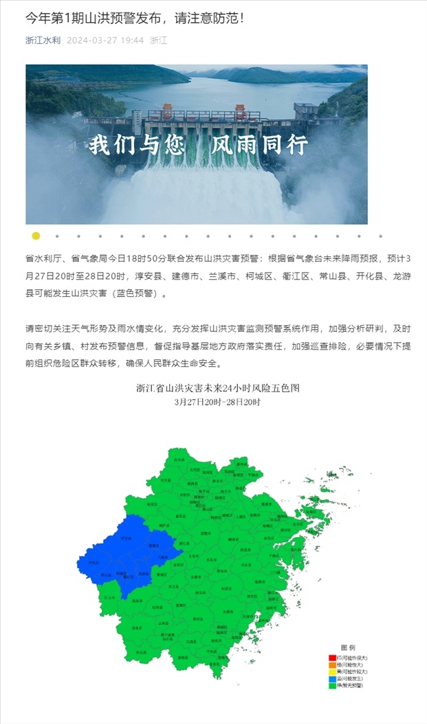 央視網(wǎng)消息:據(jù)“浙江水利”公眾號消息,浙江省水利廳、浙江省氣象局今日18時50分聯(lián)合發(fā)布山洪災害預警:根據(jù)省氣象臺未來降雨預報,預計3月27日20時至28日20時,淳安縣、建德市、蘭溪市、柯城區(qū)、衢江區(qū)、常山縣、開化縣、龍游縣可能發(fā)生山洪災害(藍色預警)。
