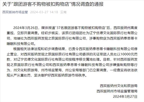 ·云南西雙版納通報(bào)“37名跟團(tuán)游客不購(gòu)物被扣購(gòu)物店”調(diào)查情況:立案調(diào)查。