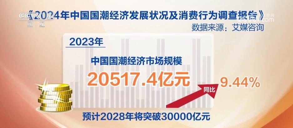 據(jù)調(diào)查,2023年中國(guó)“國(guó)潮”經(jīng)濟(jì)市場(chǎng)規(guī)模為20517.4億元,同比增長(zhǎng)9.44%,預(yù)計(jì)2028年將突破30000億元。