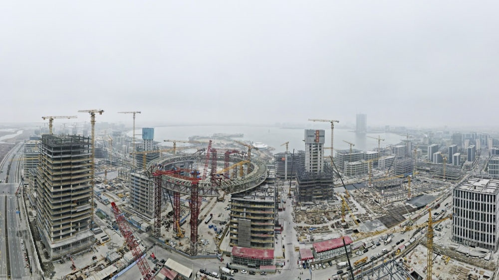 空中俯瞰建設(shè)中的上海臨港新片區(qū)滴水湖金融灣項目(2024年1月18日攝,無人機全景照片)。新華社記者 方喆 攝