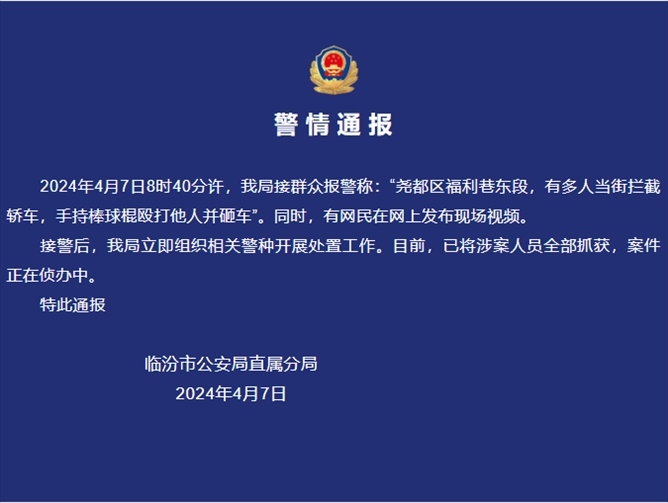·臨汾警方通報(bào)多人持棒球棍毆打他人并砸車(chē):涉案人員全部抓獲。