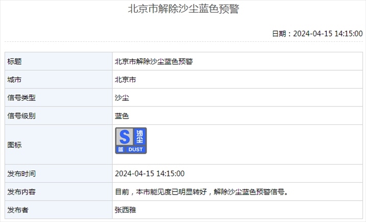 4月15日14時15分,北京市解除沙塵藍色預警:目前,本市能見度已明顯轉(zhuǎn)好,解除沙塵藍色預警信號。