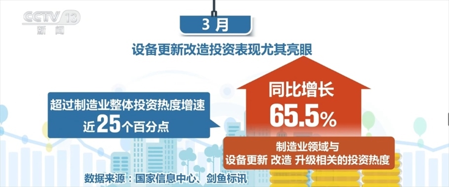 制造業(yè)領(lǐng)域則更為突出,1—2月,制造業(yè)投資熱度指數(shù)同比增長(zhǎng)13.3%,3月迅速提升至40.6%,遠(yuǎn)高于全國(guó)總體投資熱度增速。設(shè)備更新改造投資表現(xiàn)尤其亮眼,3月,制造業(yè)領(lǐng)域與設(shè)備更新、改造、升級(jí)相關(guān)的投資熱度同比增長(zhǎng)65.5%,超過(guò)制造業(yè)整體投資熱度增速近25個(gè)百分點(diǎn)。