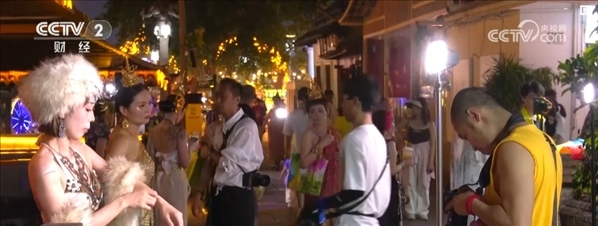 夜幕降臨,在西雙版納景洪市的告莊景區(qū)里,很多游客身著民族服飾,化著精致的妝容,正在攝影師的指導(dǎo)下拍攝寫(xiě)真。