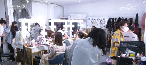 晚上8時(shí),在這家寫(xiě)真店,仍有不少消費(fèi)者在做妝造。負(fù)責(zé)人介紹,潑水節(jié)期間,他們的客流量比平時(shí)多了一倍。