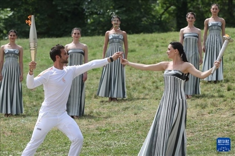 4月16日,第一棒火炬手——希臘運(yùn)動(dòng)員、東京奧運(yùn)會(huì)男子賽艇項(xiàng)目金牌得主斯特凡諾斯·恩圖斯科斯(前左)從扮演最高女祭司的演員瑪麗·米娜手中接過橄欖枝。