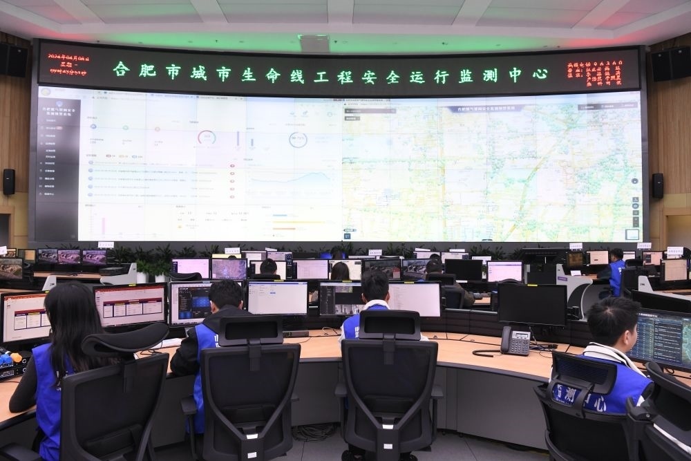 技術(shù)人員在位于清華大學(xué)合肥公共安全研究院的合肥市城市生命線工程安全運(yùn)行監(jiān)測(cè)中心值守(2024年4月8日攝)。合肥市2015年啟動(dòng)城市生命線安全工程建設(shè),逐步構(gòu)建燃?xì)?、橋梁、供水、排水、熱力、綜合管廊、消防、水環(huán)境八大領(lǐng)域立體化監(jiān)測(cè)網(wǎng),探索出一條以場(chǎng)景應(yīng)用為依托、以智慧防控為導(dǎo)向、以創(chuàng)新驅(qū)動(dòng)為內(nèi)核、以市場(chǎng)運(yùn)作為抓手的城市安全發(fā)展新模式。
