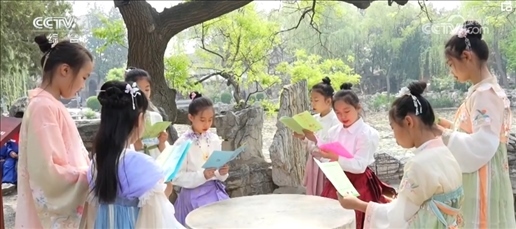 在江西南昌、河北保定,小學生們踴躍分享讀書心得。大家還走出教室,來到林蔭下、池塘邊,沉浸式誦讀經(jīng)典古詩詞。